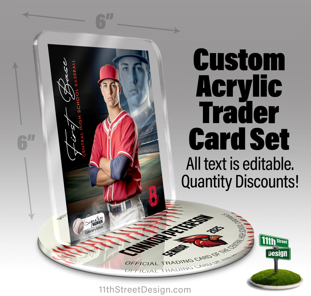 Give your athletes the ultimate collector’s item with this Custom Acrylic Trading Card Set—a bold, modern take on traditional sports trading cards! Just like the hard plastic sleeves used for pro trading cards, our durable, freestanding acrylic design protects and showcases your player’s image, position, and team details in stunning clarity.