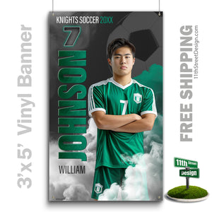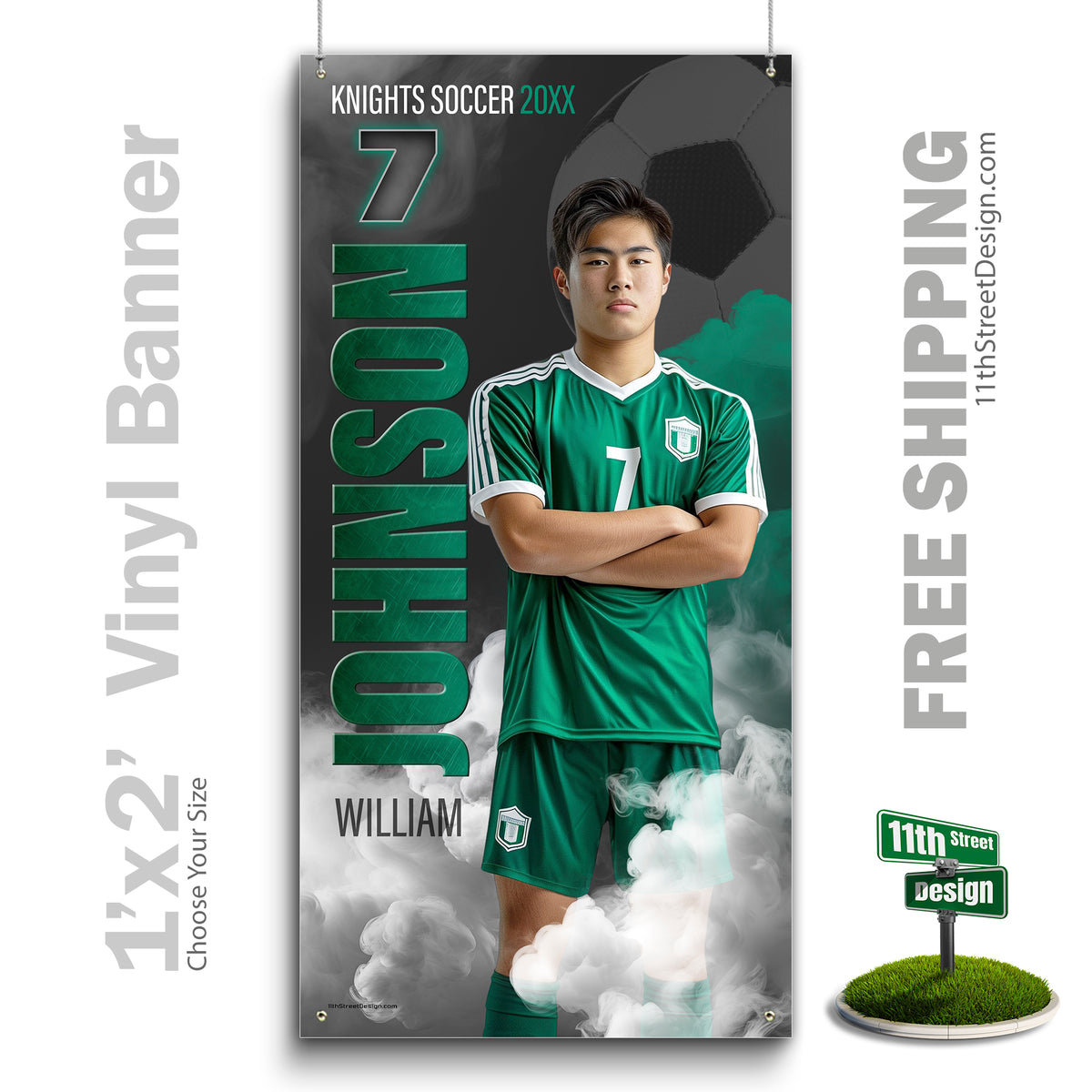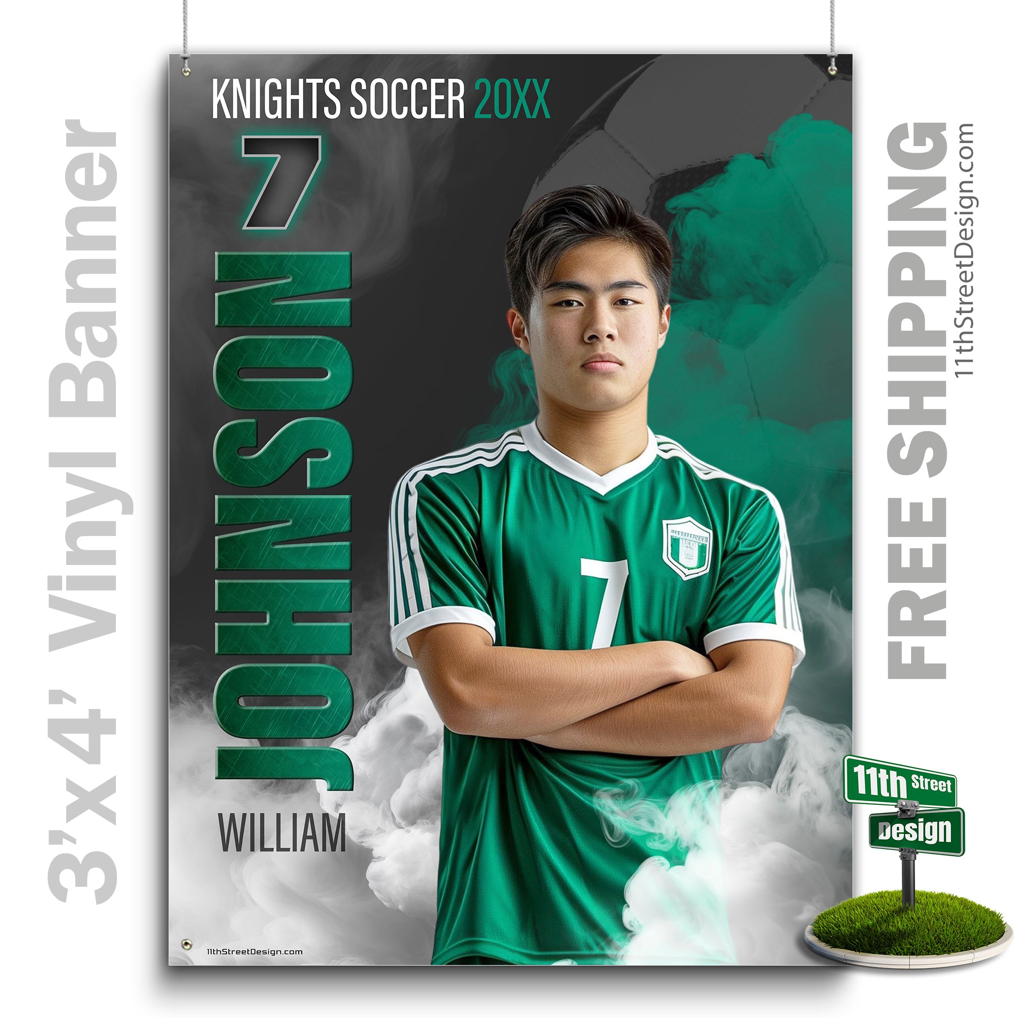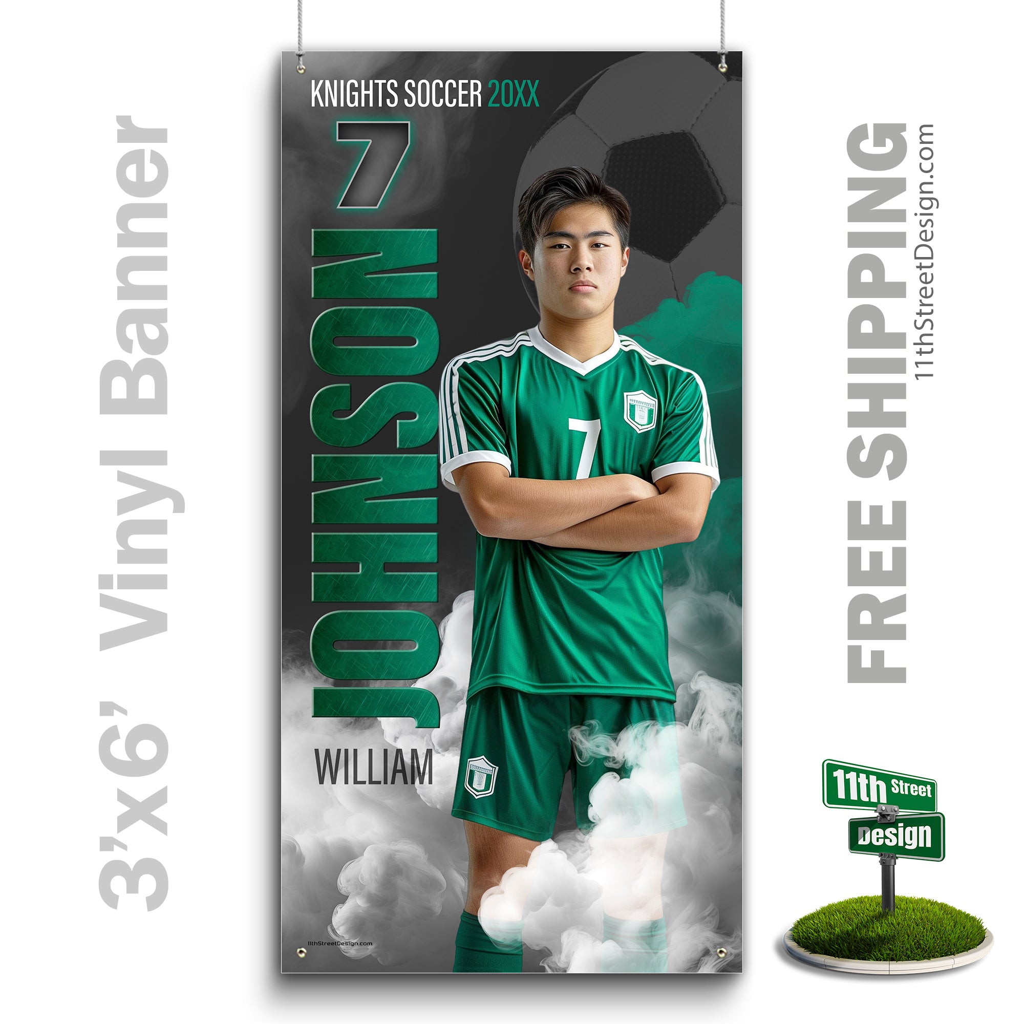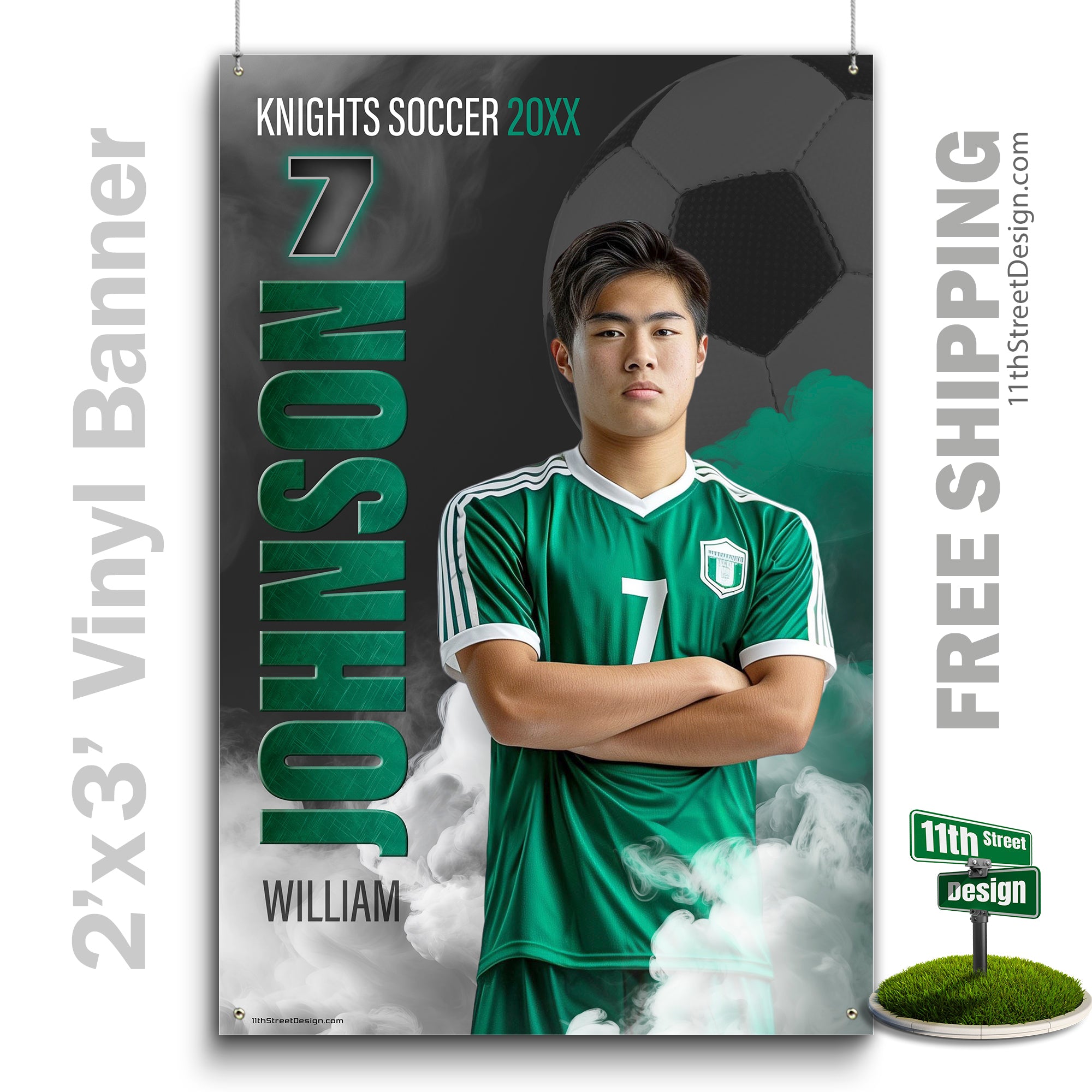 • You are purchasing a custom designed high quality 13 oz. vinyl sports banner with corner grommets. We will add your photo and text to create the perfect personalized sports banner for senior night posters or team gifts!
